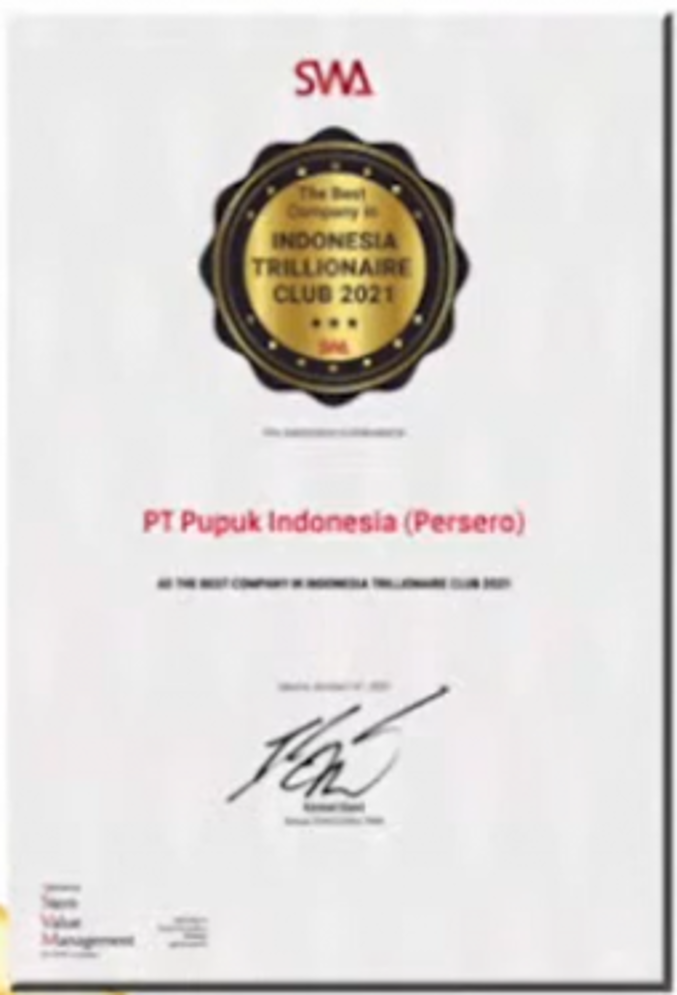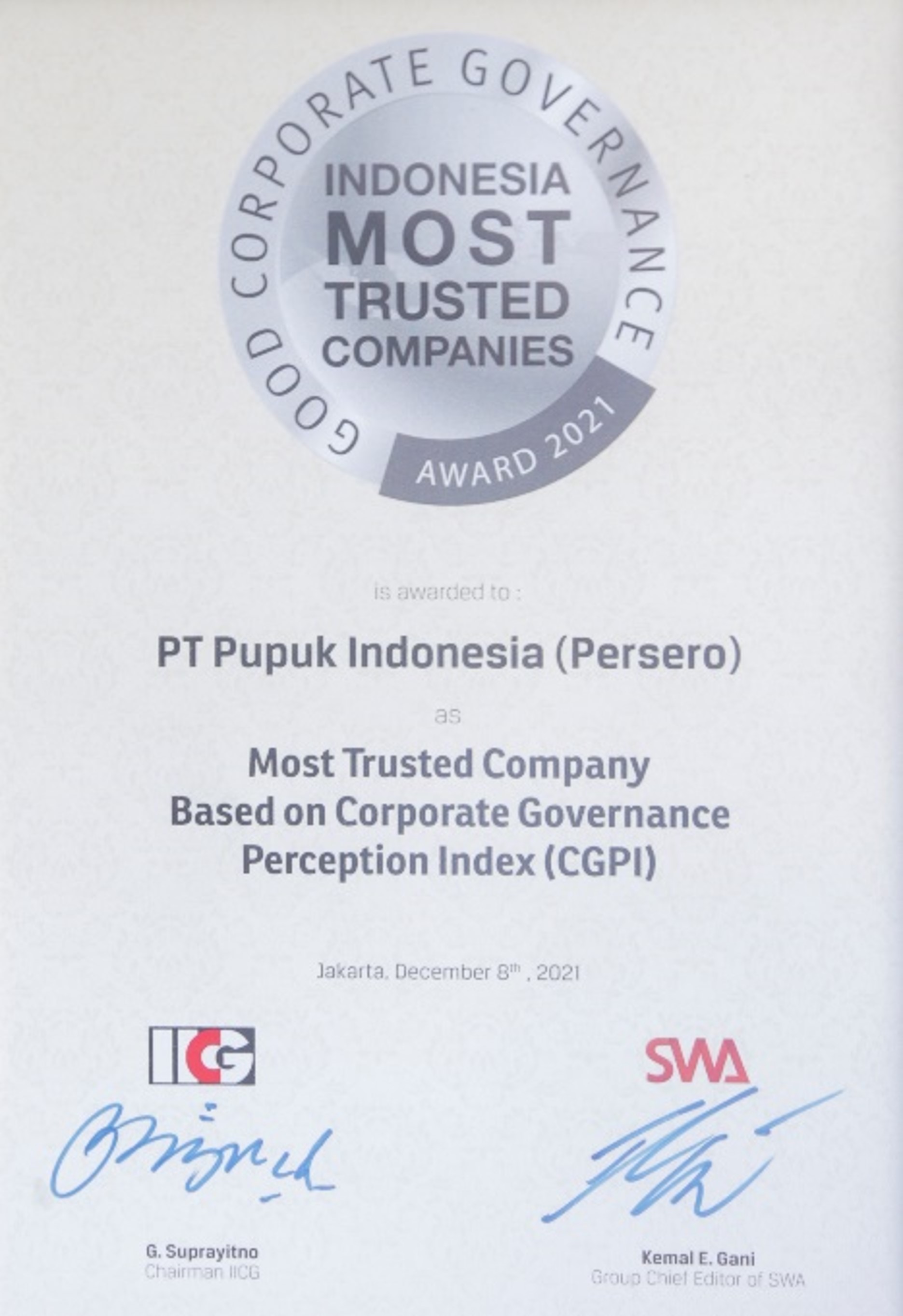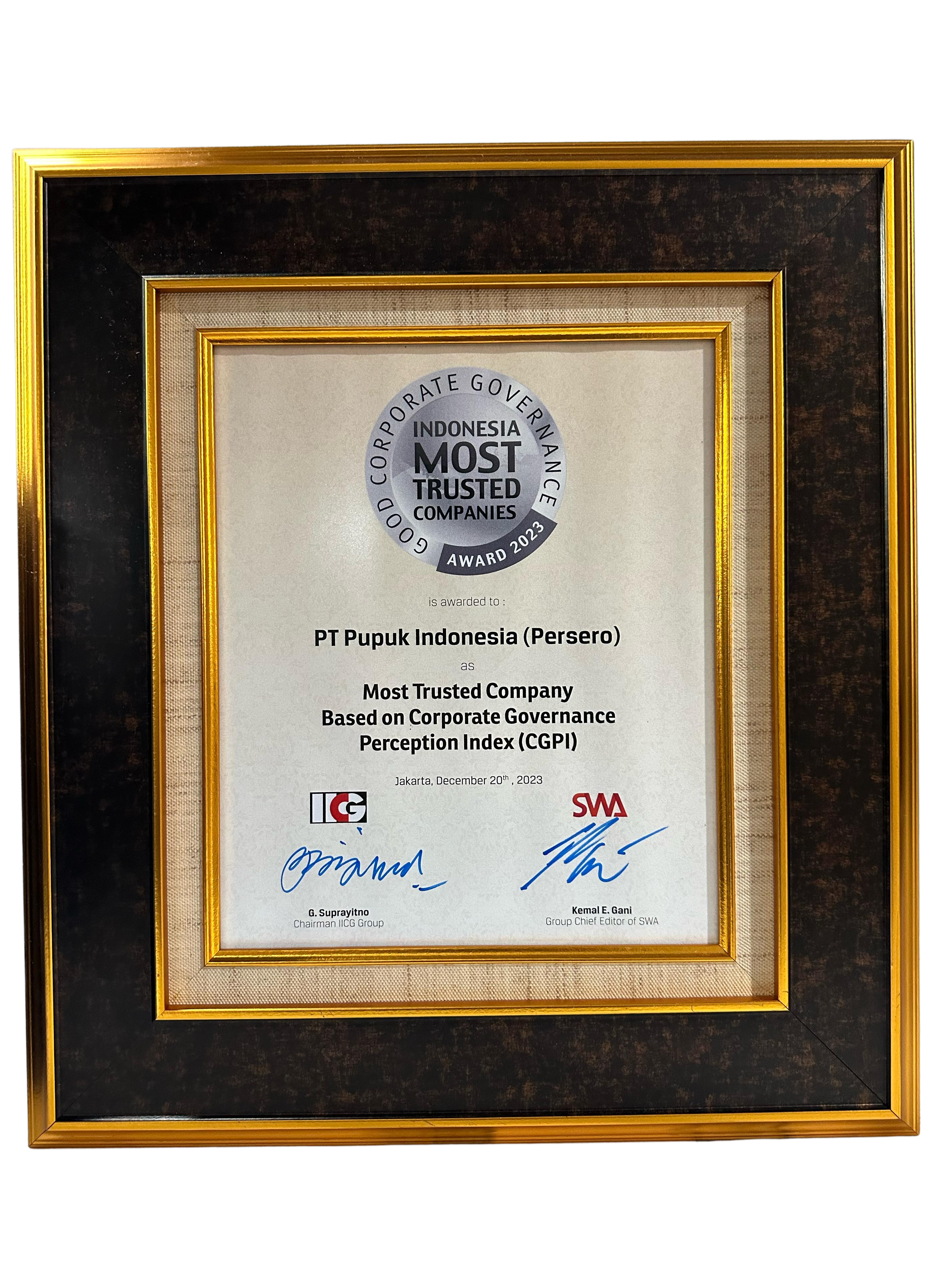 Awarded To PT Pupuk Indonesia (Persero)Most Trusted Company Based On Corporat Governance Perception Index (CGPI)IICG Group & SWA -