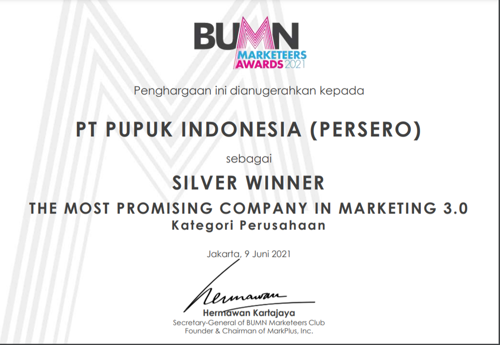 9 Juni 2021BUMN MARKETEERS AWARD 2021 Penghargaan Silver dalam kategori “The Most Promising Company in Marketing 3.0”
